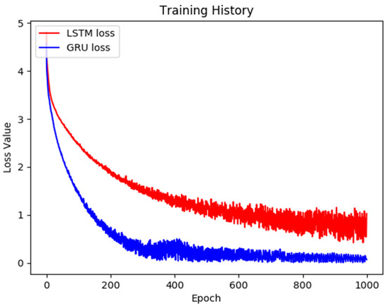 Many studies have performed in-depth explorations of chatbots, and this paper takes the framework from reference [16] as the basis for improvements. In the original version, an adversarial learning method for generative conversational agents (GCA) is applied for the chatbot model. Such a learning process originally also belonged to one of the sequence-to-sequence training regimes. However, such an approach can also transfer to an end-to-end training process by applying the specific structure. The chatbot model can generate an appropriate sentence by considering the dialogue history. The main core of GCA is LSTM, and the model also considers the current answer and the previous conversation history. The concept for this paper also was implemented with favorable results in the Keras framework [17], as presented in [18]. The Keras framework is a deep learning library which includes many Application Programming Interfaces (APIs) for building the corresponding models. Keras is also one of the most used deep learning frameworks. In [18], Keras is used for the implementation of the chatbot model. Based on the previous work in [18], this study improves the model structure and gives better performance than the original version. The detailed framework of the chatbot is exhibited in Figure 5; Figure 5a presents the original LSTM version [18]; Figure 5b displays the GRU version that was optimized in this study. In addition to the LSTM-to-GRU transformation, the differences between the two versions include the addition of two dense (fully connected) layers to the new version. The parameters are listed in Table 1. We also added a dropout to prevent overfitting and used Adam for the optimizer and categorical cross entropy for the generated loss function. A more detailed comparison of the two versions is laid out in the next section.