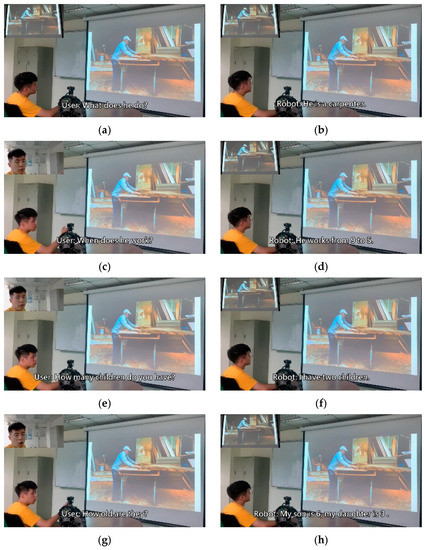 To verify the practicality of the method proposed in this study, we incorporated a humanoid robot system into the following experiment and integrated the trained model into the humanoid robot. The experiment was split into a total of four scenarios; each scenario was matched with a picture to represent the present situation. The bot, based on the situation and user dialogue in the moment, made a corresponding response. Therefore, the bot’s inputs were not limited to the user’s voice data, but also included image data. The experimental results are depicted in Figure 13, Figure 14, Figure 15 and Figure 16.