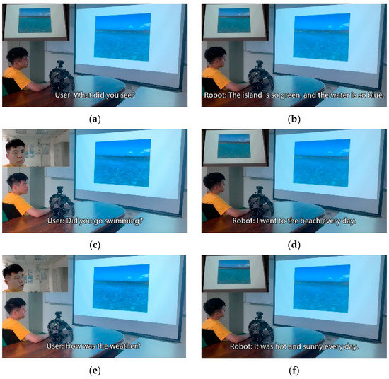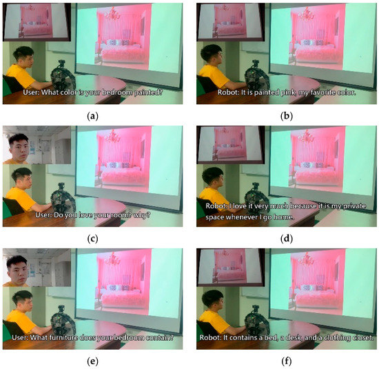 In this experiment, the algorithm developed was integrated with a humanoid robot to facilitate conversation with humans. The robot used its built-in microphone to capture users’ voice signals in addition to using the image sensor installed on its head to capture image information in the surrounding environment. Because the robot used in the experiment features multiple degrees of freedom, it is capable of aligning its sight with that of the user to converse. Moreover, it can turn its head to observe the surrounding environment while conversing. Accordingly, the robot uses the image–text conversion model to incorporate relevant textual information into the chatbot input. The content of the conversation revealed that the response provided by the robot was associated with the image information it received. This indicated that the robot does not merely consider the relationships between voice signals when providing a response. This experiment verified that the proposed chatbot model is highly applicable to humanoid robots with companionship functions. The experimental video can be accessed in [25].