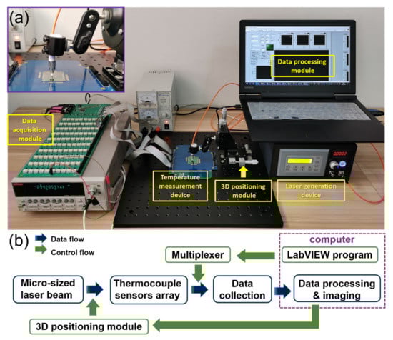 The temperature measurement system for photothermal evaluation of micron-sized lasers. (a) The photograph of the working system in research; (b) schematic diagram of the working system.