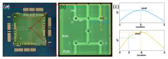 The photothermal temperature measurement system for micron-sized laser was composed of four parts: the laser generation device, the three-dimensional positioning module, the temperature measurement device, the data acquisition and processing module, as shown in Figure 1. The laser generator module could output six kinds of lasers, including 450 nm, 525 nm, 638 nm, 810 nm, 980 nm and 1064 nm. The laser output mode (continuous mode or pulse mode), light intensity, as well as the pulse width and repetition frequency in pulse mode, could be adjusted. The movement accuracy of the 3D positioning module could reach 0.03 mm, which helped the laser beam to irradiate the junction area of the thermocouple accurately. The temperature measurement device is made of nine dependent measurement units, on each of which four micron-sized Pd/Cr thin film thermocouples are prepared on the freestanding Si3N4 platform (400 nm) to improve the sensitivity and accuracy of the measurement, as shown in Figure 2a. Based on the Seebeck effect, thermocouples can convert the temperature difference between the hot and cold ends into a weak voltage between the cold ends of Pd and Cr film arms. The data acquisition and processing module is constituted of nanovoltmeter, multiplexer and LabVIEW software. The output voltage of the Pd/Cr thermocouples was in the order of microvolts; therefore, a high-precision nanovoltmeter, Keithley 2182A, was used to measure the voltage between the ends of the two ends of the thermocouples, and transmit the data to the processing part in LabVIEW software in computer, through GPIB-HS. The introduction of the multiplexer is one of the keys to realizing precise positioning of the laser beam. Through the preset program in LabVIEW, the multiplexer can sequentially turn on the electrical path to each thermocouple to enable the nanovoltmeter to detect its output voltage. Cyclic detection for the four thermocouples needed 0.4 s, because the switching time of the used mechanical switches was almost 80 ms. As a result, the continuous cyclic temperature detection of the thermocouple array was similar to real-time measuring. The LabVIEW program can not only control the data acquisition, but also display the output voltage value of each thermocouple in real time.