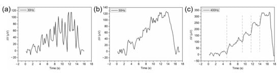 In the preliminary experiment, we observed the voltage output of the thermocouple, which represents the temperature change at the junction of thermocouples and further reflects the photothermal effect, as the peak power of the pulsed laser gradually increased. The experimental results illustrated in Figure 3 showed that when the repetition frequency of the pulsed laser was below 50 Hz, the output voltage curve behaved as many individual spikes, in which the peak value of the temperature change gradually increased with the peak power of the lasers, as shown in Figure 3a. This is because the heat irradiated on the Pd/Cr thin film thermocouple by a single pulse was quickly dissipated when the interval time between two adjacent laser pulses was too long, i.e., the frequency is very low. When the pulse frequency was larger than 100 Hz, the voltage output curve versus time drawn by the LabVIEW program displayed stepping up with the increase in the power peak of the laser beam, as shown in Figure 3c. Furthermore, the output voltage was maintained in a relatively stable range when the peak power was constant. This phenomenon makes the temperature measurement reliable for evaluating photothermal effects of lasers–Pd/Cr interactions possible. As a result, pulse frequencies with a value of ≥50 Hz were chosen in this work, and the average temperature rise on the stairs in the voltage output curve was taken as the temperature change under the corresponding laser irradiation.