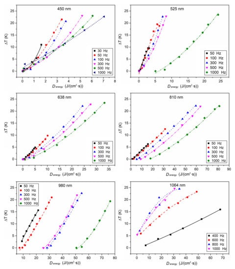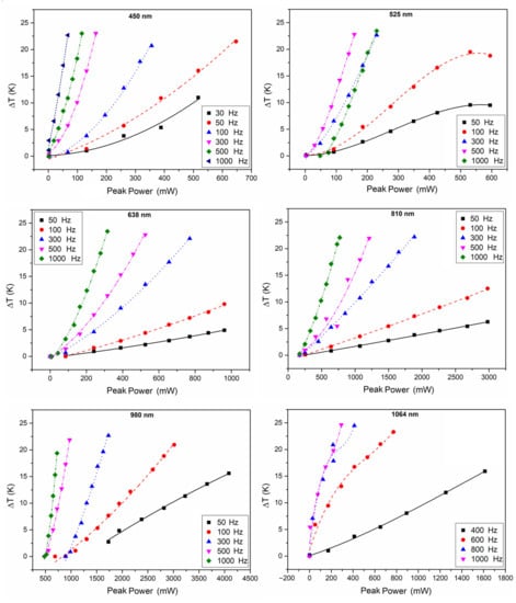 The relationships between the temperature rise of the Pd/Cr thin film thermocouple junction and the peak power of lasers with different wavelengths (450 nm, 525 nm, 638 nm, 810 nm, 980 nm, and 1064 nm) are all plotted in Figure 4. For lasers with the same frequency, the local temperature increased rapidly with the pulse frequency when the peak power was fixed, which is a conceivable result. As the frequency increased, the laser energy irradiated on the thermocouple per second increased by a corresponding multiple, resulting in increasing the temperature of the thermocouple.