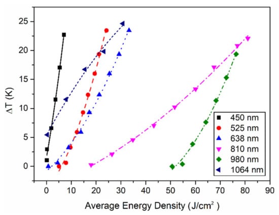 The relationships between the temperature rise and the average energy density of the lasers with different wavelengths are also plotted in Figure 5. The results show that the temperature rise is nearly linearly proportional to the average energy density of a laser when its pulse frequency is fixed, indicating that the ratio of photothermal effects to the total laser energy is relatively stable in the laser–Pd/Cr film interaction. Moreover, when the average energy density is the same, the local temperature change will decrease with the pulse frequency for the lasers with the wavelength range within 450–980 nm. This demonstrates that compared to the total irradiation duration, the laser intensity impacts more on the local temperature rise of thermocouples. However, for a laser with 1064 nm wavelength, the experimental result was the opposite; the local temperature change increased with the pulse frequency. This seems to indicate that compared with the lasers with a shorter wavelength, the strength of the photothermal effect is more irradiation time-dependent for the 1064 nm laser.