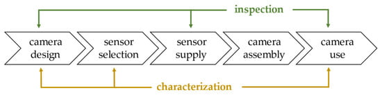Main phases of the camera development process, showing the possible points of characterization and inspection (also for calibration purposes) by our instrument.