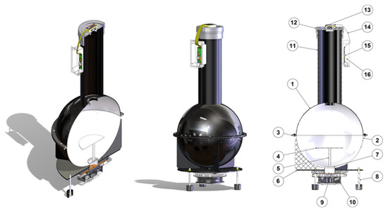 The rendered digital model of the proposed instrument in isometric view and main components: ①—Upper hemisphere. ②—Lower hemisphere. ③—Connection flange. ④—Deflector. ⑤—Support of the deflector. ⑥—Flange to support the sphere. ⑦—Separation glass. ⑧—Support feet. ⑨—LED illuminator. ⑩—Cooling system. ⑪—Dark tube. ⑫—Support for sensors/cameras. ⑬—Sensor/camera head. ⑭—Flat connection cable. ⑮—Sensor/camera Controlling Processing Unit (CPU). ⑯—CPU holder.