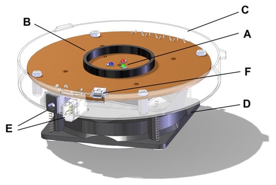 The main illuminator components: A—RGB LED. B—Tube to channel the light produced. C—Sphere attachment flange. D—Cooling system (fan). E—Power supply. F—USB socket for board control.