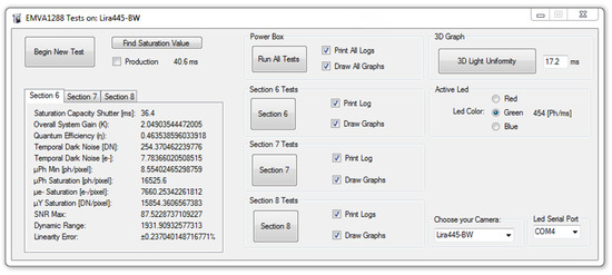 According to the developed Graphical User Interface (GUI), all the tests can be performed at once or, according to the standard, sequentially following the buttons labelled with the section numbers in Figure 6. In particular, the Section 6 button (in Figure 6) represents the calculation of quantum efficiency, system gain, sensitivity testing, linearity, and temporal noise evaluation (example results are in Section 3). The Section 7 button (in Figure 6) calculates the dark current (example results in Section 3). The Section 8 button (in Figure 6) can be used for the calculation of spatial non uniformities of the sensor of the two indices proposed by the standard, Dark Signal Non-Uniformity (DSNU1288) and Photo Response Non Uniformity (PRNU1288) [8], discussed in Section 3 and Section 4.