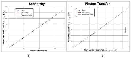Example “Sensitivity” (a) and “Photon Transfer” (b) graphs were obtained for the Alkeria Lira 424 BW camera.