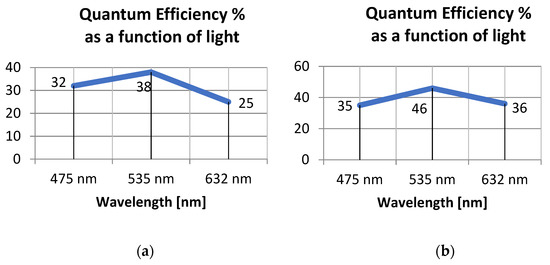 Figure 9 presents the results of the spectral analysis applied to the quantum efficiency calculation. As expected, the peak efficiency occurs using a green light (at 535 nm wavelength).
