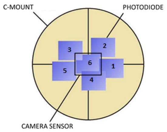 To measure the uniformity of the light irradiated on the sensor, we used the photodiode circuit described in Figure 4. The photodiode has been moved at six different positions. The six positions have been chosen around (1 to 5) and exactly coinciding (6) to the default camera/sensor position, as shown in Figure 11. The photodiode is placed at the same distance as the camera/sensor with respect to the output port of the sphere.