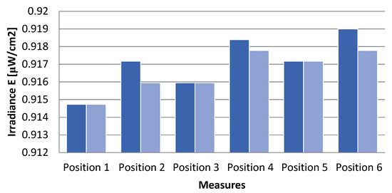 Light uniformity on the instrument measured with the photodiode described in Section 2.2. The results of two tests are shown in blue and light blue.