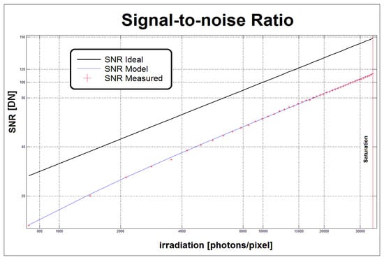 Figure 13 shows the reliability of the proposed model: the values of the signal to noise ratio, represented by red crosses, are calculated from the grabbed images; the blue line shows the least squares approximation of the values calculated using some of the model parameters presented in Table 1. A Parameters Error (PE) index was created to check the variation of the SNR calculated from the model parameters vs the actual SNR. PE is calculated as a vector of percentage differences between the samples of the two SNRs, compared to full scale. The infinite norm is calculated from this vector. The PE represents the absolute value of the maximum percentage deviation between the actual SNR and that evaluated by the model parameters measured by the instrument. The PE index for the Lira 424 BW was on average 1.58%, while for the Lira 445 BW, it was 1.49%. Since the SNR is calculated from model parameters such as quantum efficiency, gain, dark current variance, and quantization noise, the non Linearity Error (LE) can be considered a good indicator of the correctness of the parameters measured by the instrument.