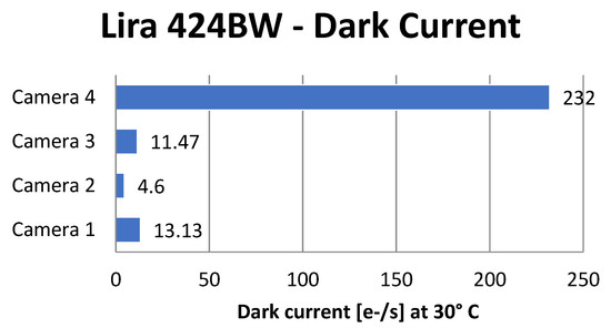 Figure 14 shows the dark current measurement for four different Alkeria cameras (1 to 4) of the same model Lira 424 BW. Camera 4 was produced 13 months earlier than the other three cameras, and, presumably, the Sony sensor used belongs to a different production batch. It can be noticed from the graph that the instrument was able to detect this variation in the Sony production process, which could not be appreciated otherwise.