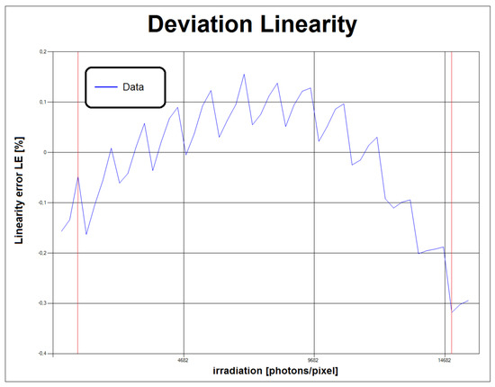 Graph generated by the control software of the instrument showing the effect of the exposure time implementation on the linearity error for the Alkeria Lira 445 BW camera. The vertical red lines highlight the minimum and maximum limits used by the regression (5–95% of the saturation value).