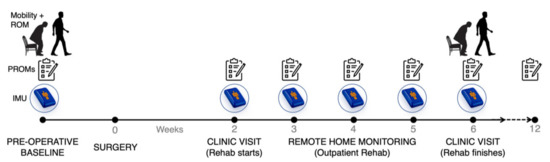 Schematic representing our workflow for post-operative remote patient monitoring of patients following total knee arthroplasty using inertial measurement units (IMUs). Mobility and knee flexion range of motion (ROM) were taken at baseline and 6 weeks post-op. Patient-reported outcome measures (PROMs) were taken at each time point as well as at 12-weeks post-op.