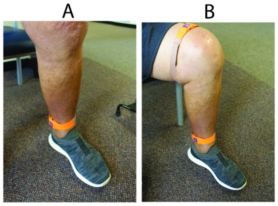 Inertial measurement unit (Vicon Blue Trident sensor) strapped to the ankle of the patient (A), as worn during weekly remote home monitoring after outpatient rehabilitation clinics. An additional thigh-worn sensor (B) was taped to the distal thigh pre-operatively and at Post-Op Week 6 to determine maximum knee flexion ankle.