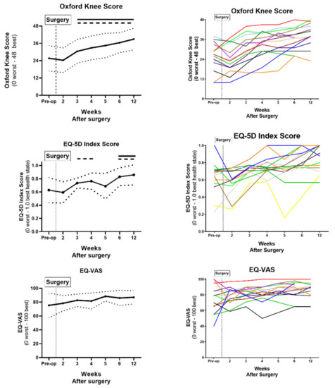 PROMs (OKS, EQ-5D Index Score and EQ-VAS) were recorded pre-operatively until Post-Op Week 12 presented as [left] mean (solid line) ± S.D (dotted line) and [right] all individual patient data represented by a different colour line. Data were analysed by one-way ANOVA with Tukey’s post-hoc analysis (p < 0.05, comparison vs. Pre-Op Score [solid bar above] and p < 0.05, comparison vs. Post-op Week 2 Score [dashed bar above]).