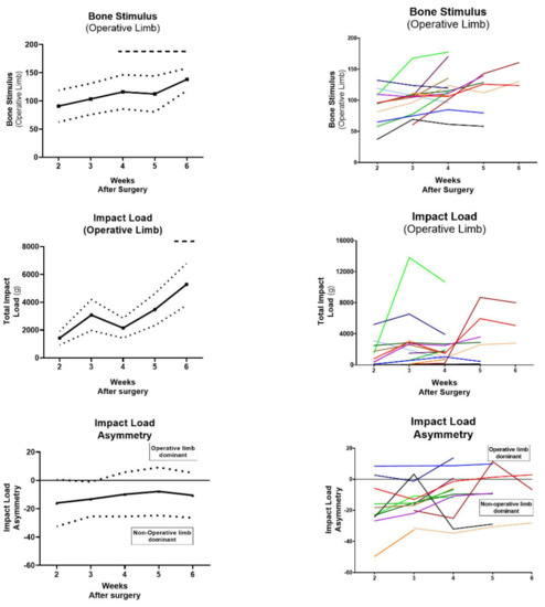 IMU Outputs (Bone Stimulus, Impact Load and Impact Load Asymmetry) presented as [left] mean (solid line) ± S.D (dotted line) and [right] all individual patient data represented by a different colour line. Data were analysed by one-way ANOVA with Tukey’s post-hoc analysis (p < 0.05, comparison vs. Post-op Week 2 Score [dashed bar above]).