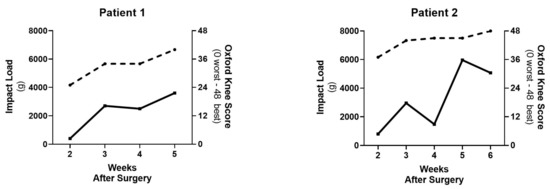 Individual data for Patient 1 and 2 with PROMs scores (OKS, dashed line) and IMU Outputs (Impact Load, solid line) over the post-operative period.
