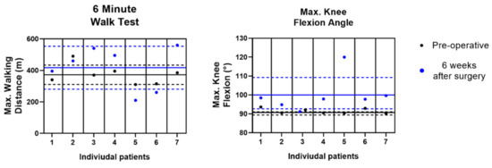 The distance walked over the 6 Minute Walk Test and Maximum Knee Flexion Angle (measured with IMU sensors) pre-operatively and at Post-Op Week 6. The mean (solid line) ± S.D. (dotted line) all individual patient data are presented.