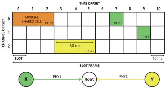 Figure 1 shows that node Y needs PHY2 to send its data to the root node. Therefore, it needs to bond three regular time slots together to one bonded slot of 30 . Similarly, the minimal shared cell is also configured with PHY2, as this is considered the PHY with the best robustness and range features, allowing all nodes to bootstrap and receive network and routing information.