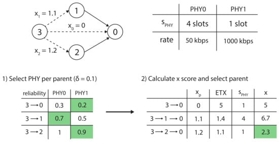 An example of the heuristic is given in Figure 2. Node 3 uses the heuristic to choose a preferred parent between nodes 0, 1 or 2 and a PHY to that parent. First, it selects a PHY per parent, with . Afterwards, it calculates the x score using the score from each possible parent, , the ETX value to that parent and the bonded slot length for the preferred PHY to that parent, , to select node 2 as its new preferred parent (using preferred PHY PHY1).