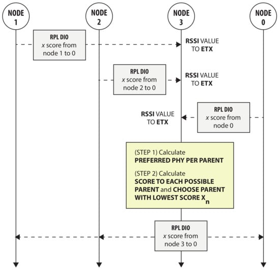 Figure 3 illustrates a simplified example of how the heuristic can be integrated in a distributed fashion in the RPL routing layer. The figure uses the same scenario and nodes as in Figure 2 in which node 3 uses the heuristic to select a new parent and PHY. First, node 3 receives RPL DIO messages from each node containing the x score (in the Metric Container of the DIO message) from each originating node to node 0 (i.e., the root node). Normally, these RPL DIO messages are broadcast to all nodes, but this is omitted in order to make the figure clear. When receiving the DIO messages, node 3 determines the RSSI value of each link and subsequently calculates the reliability for each PHY per possible parent as defined in Algorithm 1 (and it is assumed in this example that an option like LINK_STATS_INIT_ETX_FROM_RSSI of the Contiki-NG firmware is used and implemented for each possible PHY). In the next step, node 3 calculates the lowest possible score, , using the new reliability values and the bonded slot lengths of the preferred PHY per possible parent, and as such selects a new preferred parent. Finally, node 3 broadcasts this new score to its neighbors. Subsequently, the new score originating from node 3 can influence the parent and PHY choice at the neighboring nodes and the same process can take place at each of the neighbors.
