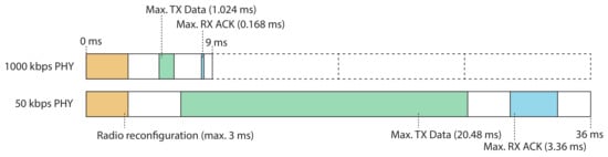 As described in Section 4.2, the two available CC1200 PHYs with data rates of 50 kbps and 1000 kbps are used. The differences between the two PHYs and their data rates are reflected in the total time slot lengths and the timing values for the different states within a time slot, as defined in the radio configurations of these PHYs. Brachmann et al. list these different timing values and how they can be determined []. The largest difference between the two PHYs is reflected in the transmission length of the data frame due to the difference in data rate (i.e., in kbps), as the transmission length equals  milliseconds. Using the timings as defined in their original radio configurations, the total time slot lengths are   and   for 50 kbps and for 1000 kbps, respectively. However, the extra time at the start of the slot to reconfigure the radio for the appropriate PHY also has to be included. Similar to Brachmann et al., 3  for this reconfiguration per time slot was added, bringing the total time slot lengths to   and  . As slot bonding requires bonding multiple slots together to form a longer time slot for PHYs with slower data rates, the total time slot length of the fastest PHY should be a common divisor of the time slot lengths of the slower PHY(s). Therefore, the slack time at the end of both time slots was extended to end up with total lengths of 9  and 36 , as shown in Table 1. This means that the regular time slots in the TSCH schedule have a length of 9  (meaning that the TSCH ASN is incremented every 9 ) and are used by the 1000 kbps PHY. When allocating a slot for the 50 kbps PHY, four regular slots of 9  will be bonded together. Figure 4 illustrates the differences between the time slots of the two chosen PHYs.
