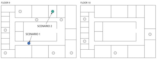 The two floors of the hardware testbed with the 13 used nodes illustrated at their locations. Two scenarios of 12 nodes were considered: scenario 1 includes the 11 grey nodes and the blue node while scenario 2 includes the 11 grey nodes and the green node.