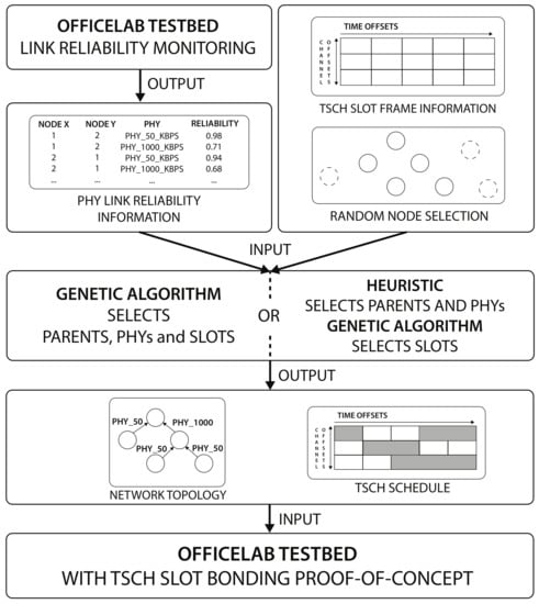 The testbed evaluation was a 3-step process as illustrated in Figure 7. First, using the slot bonding implementation, the link reliability between all nodes was monitored, in both directions, for the 50 kbps and 1000 kbps PHYs (as listed in Section 4.2). Every link was monitored for 300 , transmitting a packet of 127 bytes every second, and its reliability was defined as the average  of five consecutive observations, each over a time span of 60 . The monitored link reliability values are publicly available (https://github.com/imec-idlab/officelab-reliabilities, accessed on 9 May 2021). Links between nodes that did not connect or became disassociated during the experiment were assigned a reliability value of 0. Two different scenarios were considered, each with 12 nodes as illustrated in Figure 5: scenario 1 included the 11 grey nodes and the blue node while scenario 2 included the 11 grey nodes and the green node. It turned out that, in normal conditions, the 1000 kbps PHY was able to connect (almost) all nodes with a very good reliability. Therefore, to better emulate an industrial environment in which the reliability of different network links can heavily vary and/or some nodes can not connect with certain PHYs, different transmission powers were used for the 2 PHYs and a part of the 1000 kbps PHY links was disabled in both scenarios. For the 50 kbps PHY, the transmission power was set to 14 dBm, while for the 1000 kbps PHY it was set to 0 dBm. Additionally, uniformly at random, 70% of the 1000 kbps PHYs links of each node (i.e., assigning links a reliability value of 0) were disabled. The goal of the monitoring step was to determine the link reliability values of all nodes to each other for each PHY, as these would be used by the heuristic to make the parent and PHY selections. While this monitoring step simplified our evaluation of the heuristic, in an integrated solution this could be replaced with run-time statistics as explained in Section 3.6. As such, afterwards, these reliability values were fed, together with the slotframe information and the selected set of nodes (including a randomly selected root node), to the GA scheduler. In the case of the heuristic, the GA only decided the slot allocations as the heuristic determined the parent and PHY selection for each node. Finally, the resulting network topologies with selected parents and PHYs and the TSCH schedules were configured on all selected nodes in the hardware testbed and the results were monitored for 300 .