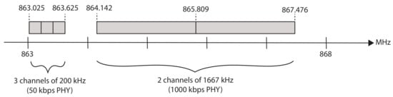 The implementation supports the 2 sub-GHz PHY configurations shown in Table 1, that is, the 2-GFSK modulation with 200 kHz channel spacing and 50 kbps data rate and the 4-GFSK modulation with 1667 kHz channel spacing and 1000 kbps data rate. PHY layers in the sub-GHz spectrum are used because of the better propagation characteristics compared to the  GHz spectrum []. Both CC1200 radio configurations are by default available in the Contiki-NG repository. The implementation can be extended to support more PHY radio configurations. As indicated in the work of Van Leemput et al. and as seen in Table 2, taking into account the strict regulation of the sub-GHz spectrum, 44 channels of 200 kHz and 4 channels of 1667 kHz are possible (with frequency overlap) in the 7 sub-GHz bands divided over the European Union 863-870 MHz and 873-920 MHz spectra [,]. Such a channel allocation with frequency overlap actually avoids wasting bandwidth and allows for a rich frequency diversity. However, the frequency overlap can also result in inter-PHY interference and possible duty cycle saturation for certain frequency bands. The alternative is allocating channels for the different PHYs without frequency overlap (thus reserving different parts of the wireless spectrum for different PHYs), with the consequence of limiting the frequency diversity.