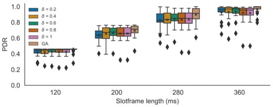 PDR simulation results for different  values for different slotframe lengths, comparing the heuristic with the GA scheduler. The x denotes the mean value. The diamond shapes represent outliers that are values smaller than the minimum (i.e., the lower whisker) or larger than the maximum value (i.e., the top whisker).