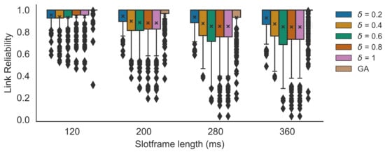 Mean link reliability values for different slotframe lengths, for different  values of the heuristic. The x denotes the mean value. The diamond shapes represent outliers that are values smaller than the minimum (i.e., the lower whisker) or larger than the maximum value (i.e., the top whisker).