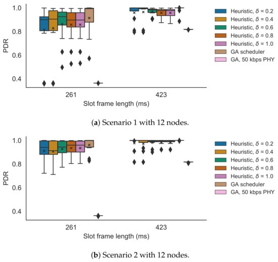 Additionally, Figure 11 shows the benefits of using multiple PHYs when only allowing the 50 kbps PHY results in PDRs of 0.36 and 0.82 for scenario 1 and PDRs of 0.36 and 0.82 for scenario 2, for the 261  and 423  slotframe, respectively. This is explained by the fact that the 50 kbps PHY requires bonded slots with a length of four regular slots, thereby occupying a lot of space in the schedule per transmission attempt and not allowing sufficient free space for extra slots or other nodes to allocate slots. The results for only using the 1000 PHY are not shown as that did not allow for fully connected topologies.