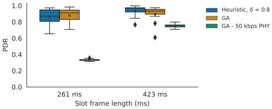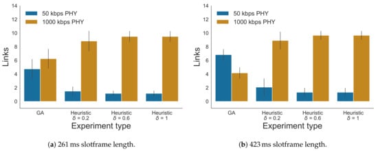 In general, it was observed that the testbed results approximate the theoretical values shown in Figure 11b. As expected, with the longer slotframe length, the mean PDR values also increased compared to the shorter slotframe length. More specifically, in the case of the 261  slotframe length, the GA performed better than the heuristic with PDRs of 0.88 and 0.86, respectively, meaning there was only a 2.3% decrease in performance. The GA that can only use the 50 kbps PHY was outperformed by its multi-PHY counterparts as it only achieved a PDR of 0.33 (i.e., the GA and the heuristic increased on this performance with 166.7% and 160.6%, respectively). When using a 423  slotframe length, the heuristic actually performed slightly better than the GA with PDRs of 0.94 and 0.88, and both again outperformed the single-PHY GA that had a PDR of 0.75 (i.e., the GA and the heuristic increased on this performance with 25.3% and 17.3%, respectively). The heuristic performing better than the multi-PHY GA is explained by the observation of link reliability values during these multi-hop experiments, which differed from the reliability values observed during the monitoring phase (on which the parent, PHY and slot allocation was based). More specifically, the monitoring results showed better performance mainly for the 50 kbps PHY compared to the values observed during the multi-hop experiments. As the GA more often uses 50 kbps PHY than the heuristic does, the PDRs of the GA was more negatively affected as a result. As such, these results actually motivate the integration of the heuristic in a routing protocol’s objective function with real-time link reliability monitoring to dynamically adapt to varying link conditions, as discussed in Section 3.6. Overall, the results clearly show the efficiency of the proposed parent and PHY selection heuristic.