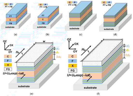 The studied [F/X]m/F/C/[F/X]n/F multilayered structure is a rectangular MI element with transverse effective magnetic anisotropy. The induced magnetic anisotropy is formed due to application of the technological magnetic field during multilayer deposition. The MI element consists of a highly conductive non-ferromagnetic central layer C of a thickness 2d0 and two external multilayers: ferromagnetic top and bottom parts. The external multilayers contain soft magnetic sub-layers F of thickness d2 separated by non-ferromagnetic spacers X of thickness d1. The corresponding conductivities of the materials C, X and F are σ0, σ1 and σ2. The multilayered element length and width are l and w, respectively. The film structure is non-symmetric, that is, the top external multilayer is either thicker than the bottom one, m > n, either thinner than the bottom multilayer, m < n. The layer of ferrogel with the thickness of d3 is placed on the top surface of the film structure (Figure 1e,f). The driving voltage is used to feed the element: U = Udrexp (−iωt) (t is the time ω is the angular frequency of the electromagnetic filed and i is the imaginary unit).