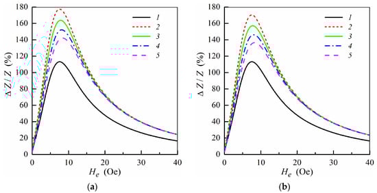 MI ratio ΔZ/Z as a function of the external field He at f = ω/2π = 100 MHz for the multilayered element with ferrogel placed onto the surface of thin layer (m = 3, n = 4) (a) and onto the surface of thick layer (m = 4, n = 3) (b) (see also Figure 1e,f). Curves 1, multilayered film without gel; curves 2, film with pure gel (hydrogel) (Hp = 0); curves 3, Hp = 0.25 Oe; curves 4, Hp = 0.5 Oe; curves 5, Hp = 0.75 Oe. Parameters used for calculations are l = 1 cm, w = 0.2 mm, 2d0 = 500 nm, d1 = 3 nm, d2 = 100 nm, M = 750 G, Ha = 6 Oe, ψ = −0.1π, σ0 = 5 × 1017 s−1, σ1 = 5 × 1016 s−1, σ2 = 3 × 1016 s−1, κ = 0.02, d3 = 1 mm, Hc = 6.5 Oe, H1 = 750 Oe and ε = 80.