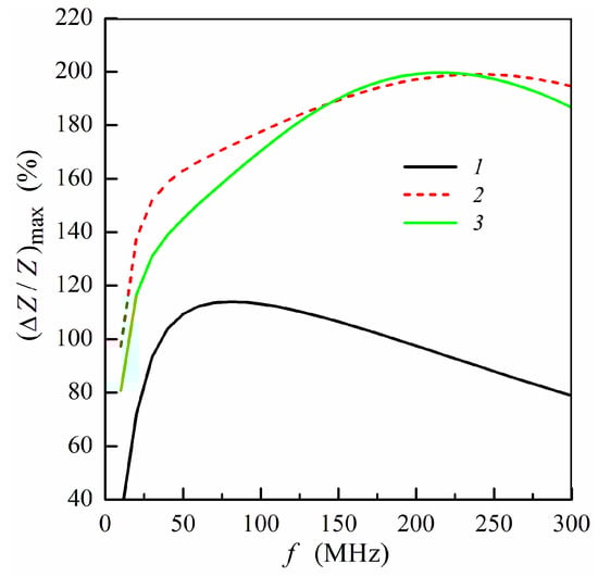 Frequency dependence of maximum MI ratio (ΔZ/Z)max: curve 1, multilayered film without gel; curve 2, multilayer with pure gel (hydrogel) placed onto the surface of thin layer (m = 3, n = 4); curve 3, multilayer with pure gel placed onto the surface of thick layer (m = 4, n = 3) (see also Figure 1e,f). Other parameters used for calculations are the same as in Figure 2.