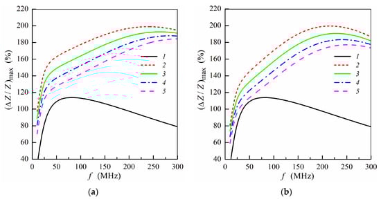 Frequency dependence of maximum MI ratio (ΔZ/Z)max for the multilayered sensitive element with ferrogel placed onto the surface of thin layer (m = 3, n = 4) (a) or onto the surface of thick layer (m = 4, n = 3) (b) (see also Figure 1e,f). Curves 1 correspond to the multilayered film without gel; curves 2, film with pure gel (hydrogel) (Hp = 0); curves 3 Hp = 0.25 Oe; curves 4, Hp = 0.5 Oe; curves 5, Hp = 0.75 Oe. Other parameters used for calculations are the same as in Figure 2.
