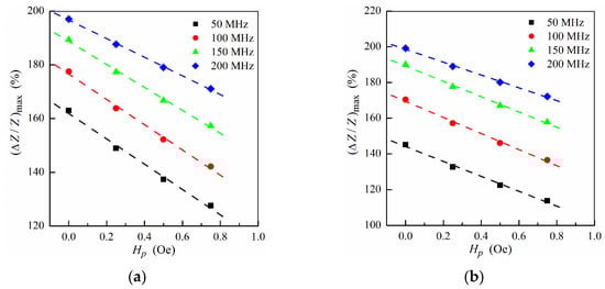 Maximum MI ratio (ΔZ/Z)max as a function of the field Hp at different frequencies for the multilayer with ferrogel placed onto the surface of thin layer (m = 3, n = 4) (a) and onto the surface of thick layer (m = 4, n = 3) (b) (see also Figure 1e,f). Other parameters used for calculations are the same as in Figure 2.