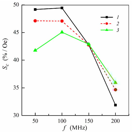 Figure 6 shows the frequency dependence of the concentration sensitivity calculated for different multilayer–ferrogel structures at selected frequencies. In a low-frequency range, maximum concentration sensitivity is achieved for symmetric multilayer. For the non-symmetric multilayers, the sensitivity Sc is higher when the ferrogel is placed onto the surface of the thin magnetic layer of the MI element. For three studied multilayered films, the values of Sc become the same at the frequency of 150 MHz. At higher frequencies, the concentration sensitivity drops and has higher values for the non-symmetric multilayers (Figure 6).
