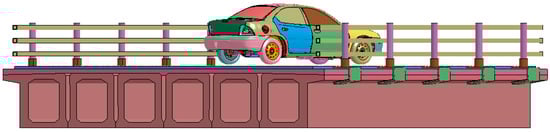 According to the Chinese guardrail safety performance evaluation standard [], as shown in Table A3 in the Appendix A, and in the applicable scope of a bridge, a three-level protective guardrail was designed and the specific size is shown in Figure A1 in the Appendix A []. The distance between the guardrail posts is 2 m, for a total of 10 m. The material properties of the steel strands and steel components of the guardrail are listed in Table A4 in the Appendix A, and the specific data of the guardrail model are listed in Table A5 in the Appendix A.