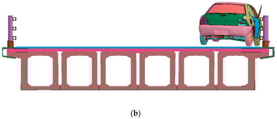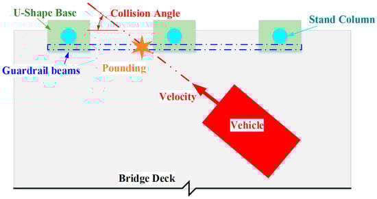 A middle span of 10 m is chosen for the calculations, and the box girder and the bridge deck are both C50 []. C50 is concrete with a compressive strength of 50 MPa. Figure 4 shows a 3D model of the collision between a car and the bridge guardrail. It can be seen from Figure 5 that the collision angle is the angle between the car velocity and the guardrail beam.