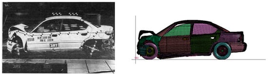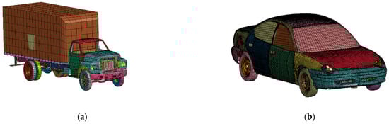 Two vehicle models were used in this study: one is Ford’s simplified model (35,353 elements) single-unit truck (SUT), and the other is a Dodge Neon (270,752 elements) (Figure 7) []. These models were downloaded from the NCAC website. The experimental tests include frontal collisions to verify each model [,]. Both models are highly correlated with the experimental results. Different vehicle speeds were investigated in this study. The vehicle’s initial speed ranged from 60 km/h to 100 km/h, and most of the vehicle’s initial speed is 100 km/h. The vehicle masses are 1.5 t for the Dodge Neon and 10 t for the Ford SUT. The quality of the Ford SUT changed when changing the quality of the goods, and the quality of the Dodge Neon changed when adjusting the quality of the engine. Table A6 in the Appendix A shows the vehicle model data and vehicle material parameters.