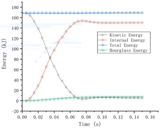 As shown in Figure 8, in order to verify the accuracy of the vehicle–guardrail collision model, the numerical simulation between the vehicle and the rigid wall was repeated using LS-DYNA to compare the experimental collision results []. Figure 9 shows the energy–time curve. As shown in Figure 9, the deformed shape of the vehicle in the simulation model (on the right) is very consistent with the results of the crash test (on the left) []. In Figure 9, the moment at 0 s represents the start of the collision. For the vehicle model, the entire collision process lasts for 0.15 s. The hourglass energy is caused by the use of reduced integration in the display analysis. The so-called reduced integration means that the number of integration points in the calculation of the unit is less than the actual number. This operation can speed up the calculation speed, but it causes a zero energy mode of the unit, which is the hourglass energy. It can be seen from Figure 9 that the hourglass energy used to evaluate the crash performance of a car crash is only 2.3% of the initial kinetic energy, which is less than the maximum 5% of the total energy []. It is assumed that the accuracy of the finite element model can be guaranteed and that the simulation method of the collision process can be used in the subsequent simulations of this study.