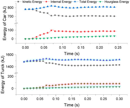 From Figure 10, due to the deformability and friction of the assembled guardrail, the internal energy of the car and truck system increases steadily after collision and reaches maximum values of 103 kJ and 59 kJ at 0.075 s. Then, the kinetic energy of the car and truck system increases slightly and the internal energy decreases slightly. This is because the deformation of the steel strand is gradually restored, the internal energy of the guardrail system decreases, and the kinetic energy of the vehicle increases. At the end of the simulation, the internal energy gradually stabilizes at 88 kJ and 82 kJ.