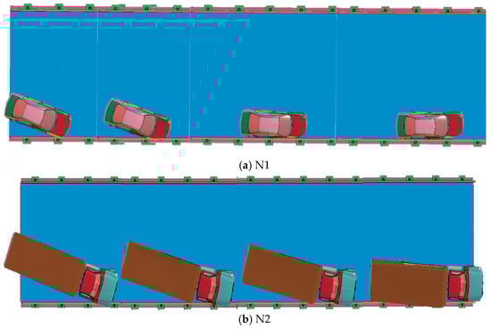 According to Chinese regulations, the barrier collision conditions should meet the requirements in Table A3 in the Appendix A. Therefore, the results are analyzed from samples N1 and N2. When the initial kinetic energy is completely transformed into internal energy, hourglass energy, and residual kinetic energy, the finite element results are reliable []. The hourglass energy is calculated for every model. As shown in Figure 10, the N1 and N2 hourglass energy accounts for 4% and 2% of the total energy, respectively, which are both less than 5% of the total energy. Therefore, the hourglass control does not affect the accuracy of the results [].