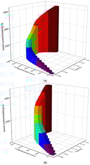 The X axis is the longitudinal direction of the guardrail while the Y axis is the lateral direction of the guardrail in Figure 12. Figure 12 shows the displacement–time curve of a point on the left seat of the car and a point on the truck seat in the x and y directions. Figure 12 shows the trajectory of the car and the truck. It can be seen from Figure 12 that the displacement of the car in the cross-bridge direction reaches a maximum value of 554.4 mm at about 0.165 s. After the car turns, the displacement gradually decreases in the cross-bridge direction. The cross-bridge displacement of the truck reaches a maximum of 780.15 mm at about 0.23 s, and then, the truck changes its direction.