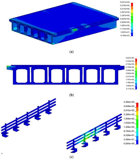 It can be observed that the main beam of the traditional guardrail is more severely damaged than the main beam of the prefabricated guardrail. This is because the traditional guardrail is embedded in the concrete of the main beam. When the car collides with the guardrail, the main beam structure is destroyed while, for the prefabricated guardrail, the structure is not embedded in the bridge structure, so the main girder is not damaged. It can be seen from the figure that the maximum tensile stress of the main beam of the traditional guardrail structure is 20.1 MPa, which is much greater than the 3.6 MPa of the fabricated guardrail. The concrete main beam of the traditional guardrail structure is damaged by tension. The maximum V-M stress of the traditional guardrail structure is 43.8 MPa, which is much larger than the 5.9 MPa of the fabricated guardrail structure.